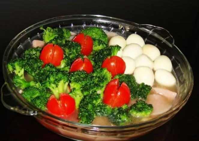 - 做法:西蘭花焯水;鵪鶉蛋煮熟剝皮;火腿切丁。火腿加水煮沸后轉(zhuǎn)小火煮10分鐘,加入鵪鶉蛋、西蘭花、小番茄再次煮沸,調(diào)味即可。
